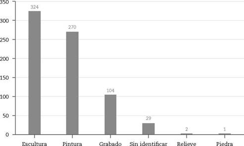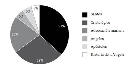 Sobre un total de 616 imágenes cuya iconografía se identificó en los inventarios, no deja de ser llamativo que el tema que se podría considerar el fundamento de la catequesis (la vida de Cristo) se vea, no solo superado en porcentaje por las representaciones de santos, sino también casi igualado por el número de representaciones de advocaciones marianas, que asciende hasta el 20% correspondiente a 125 piezas. A esto se suma el hecho de que las imágenes centradas en los dogmas de la Iglesia -la trinidad o la inmaculada concepción de María- no tienen ninguna relevancia porcentual, en la medida en que solo se registraron tres casos: una pintura de la Santísima Trinidad en el templo doctrinero de Motavita; un relieve en yeso que representa la trinidad, en Monguí, y una pintura de la limpia concepción coronada por la santísima trinidad en el mismo templo (AGN, VB, 13, f. 1001 r.; AGN, FI, 10, ff. 658 v., 659 r.). Los números aquí revelados pueden tener entonces dos posibles explicaciones: una, que la imagen -entendida en términos de catequesis básica- no fue protagonista dentro del proceso de evangelización neogranadina, y la otra, que su relevancia estuvo reducida a la construcción -siguiendo lo planteado por Jaime Borja- tanto de un cuerpo individual como de un cuerpo social modelado a partir del ideal proyectado por los santos (Borja, Pintura y cultura 53-54, 61-63).