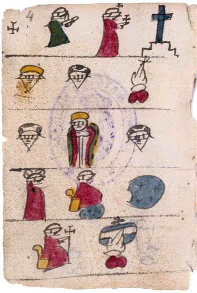 Sin embargo, el uso del verbo por encima de la imagen no fue óbice para que en las instancias más tempranas de la evangelización se empleara lo visual como único canal de comunicación posible entre doctrineros y naturales. De este fenómeno nos ha quedado como testigo el catecismo atribuido a fray Pedro de Gante, uno de los primeros franciscanos que arribaron a la Nueva España. En este pequeño documento, conservado hoy por la Biblioteca Nacional de España (véase figura 1), se hace presente el uso de imágenes muy sencillas, dirigidas a expresar a partir de lo simbólico temas tan extraños para el indígena como la existencia de Jesús, su resurrección o la presencia de un papa entronizado como vicario de Cristo y príncipe de la Iglesia. Imágenes similares a las utilizadas por el fraile franciscano en la Nueva España fueron quizá aprovechadas también en otros territorios, aun cuando de ellas no ha quedado huella. Lo cierto es que en los doscientos años transcurridos entre 1550 y 1750, los templos doctrineros de la Nueva Granada no habían llegado a consolidar grandes colecciones iconográficas, estableciendo cifras que -siguiendo las diligencias de visita de Verdugo y Oquendo- fluctuaban entre la veintena y el medio centenar de imágenes por templo (gráfico 2).
