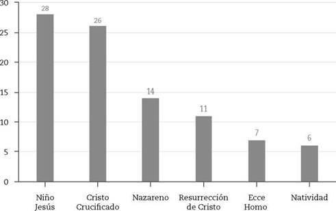 Si tomamos como punto de partida la iconografía cristológica, aquella que supuestamente debía “estructurar” el discurso catequético, nos encontramos no solo con que esta ocupa una segunda posición en términos porcentuales, sino también con el hecho de que los “temas” que más se representan no reflejan propiamente lo catequético. Las representaciones más recurrentes -en materia cristológica- son el Niño Jesús, la Crucifixión de Cristo y lo que en los inventarios se reconoce como el Nazareno, iconografía de Jesús con la cruz a cuestas y vestido con túnica roja o púrpura6. A estos temas les siguen las imágenes de la resurrección de Cristo, el Ecce Homo y la Natividad (véase gráfico 3). La relevancia del Niño Jesús dentro de estas iconografías puede explicarse como un fenómeno vinculado a la catequesis de los niños, aspecto que iría de la mano con la idea de un cuerpo social sacrificial modelado a partir de la imagen del Cristo sufriente, representado en las imágenes de la pasión. Aun así, el número de imágenes relacionadas con Cristo no es, como se podría suponer, representativo.