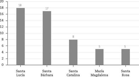 En el caso de las santas, las imágenes inventariadas ubican a santa Lucía y santa Bárbara como las más representadas (véase gráfico 4), fenómeno que se explica por el poder para conceder milagros relacionados con la curación de diversos males (santa Lucía), o con el apaciguamiento de fenómenos naturales como las tormentas (santa Bárbara). Cabe anotar aquí que para 1755, momento en el que se llevaron a cabo las visitas analizadas, el poder milagroso de ambas santas era ya bastante conocido, lo que las había convertido en parte fundamental de la piedad neogranadina. De esto da cuenta la aparición temprana de un templo de santa Barbara en Santafé de Bogotá, levantado a expensas de la devoción del encomendero Lope de Céspedes (Plaza 220). Santa Lucía, por su parte, sería acogida por advocación principal de doctrinas como la de los indios coyaimas y natagaimas en 1621 (Vargas 173-175), así como de algunas cofradías constituidas y regentadas por indígenas11. Pero si la fenomenología propia del milagro se veía proyectada e instrumentalizada a partir de los mencionados santos y santas, dicho carácter se acentúa aún más en las “advocaciones marianas”, iconografía que tras los santos y la imagen cristológica completaba el círculo de los discursos visuales más difundidos en las doctrinas aquí analizadas.