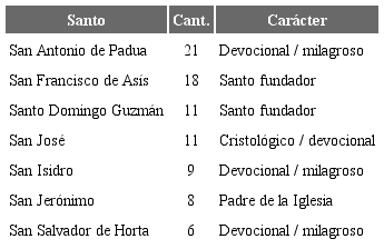 Para demostrar lo antes mencionado nos centraremos -en primera instancia- sobre el porcentaje más amplio dentro del número de temas iconográficos visibles en los templos de doctrina: los santos. A partir de un total de 228 santos listados en las visitas, el 73% (166 imágenes) corresponde a personajes masculinos, mientras el restante 27% (62 imágenes) se halla integrado por representaciones femeninas. Ahora bien, tanto en el caso de los santos como en el de las santas, es llamativa la presencia recurrente de lo que podríamos llamar íconos milagrosos (tabla 1).