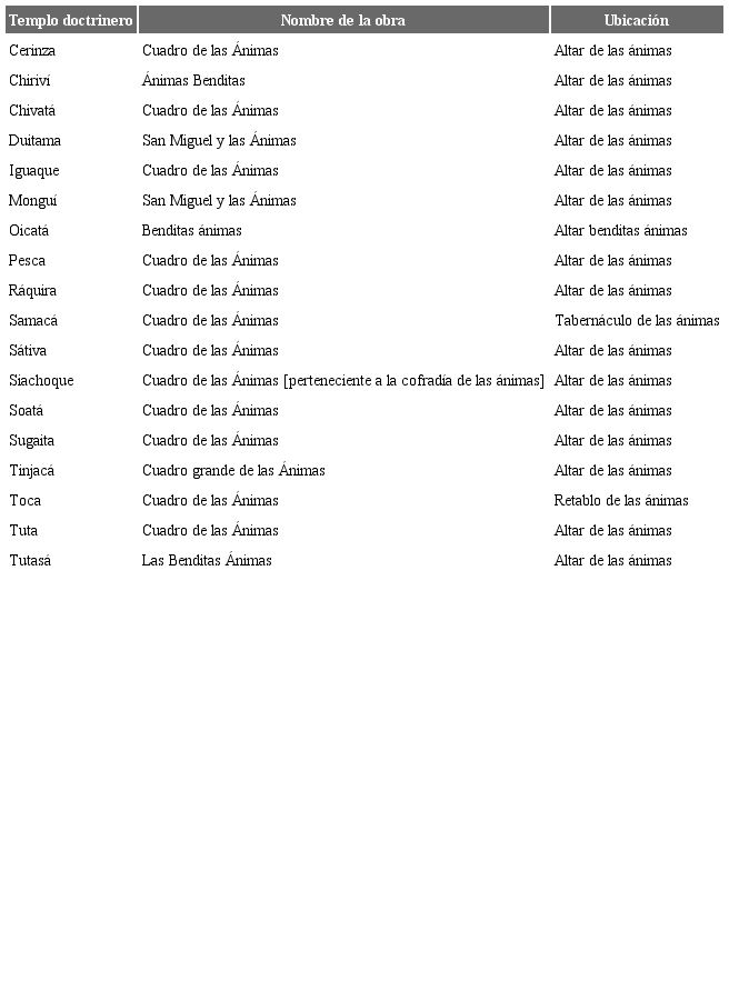 En los inventarios hechos por Verdugo y Oquendo se registra la existencia de dieciocho pinturas o “quadros de ánimas”, relacionados con retablos independientes dedicados exclusivamente a esta iconografía. La presencia de lo que en los inventarios se describe como “altar de las ánimas” (tabla 2) permite suponer el concurso de una devoción articulada en torno a las “benditas ánimas del Purgatorio”, hipótesis que se ve reforzada a partir de la presencia en Siachoque de una cofradía en torno a las “ánimas” (AGN, VB, 13, f. 985 r.) y la celebración en Chiriví de una festividad alrededor de esta iconografía. En este último caso el templo no solo contaba con un “quadro de las Animas Benditas”, sino que a su vez poseía un “estandarte de las benditas ánimas” relacionado con ciriales y otros objetos de corte procesional (AGN, VB, 13, f. 1017 v.). El dogma se sustentaba aquí en una imagen idolatrada, ocultada -a partir de velos negros o púrpuras- y, por ende, dotada de vida. Tal uso de la imagen encuentra concordancia con una cultura barroca que, vinculada a la teatralización impulsada por la Contrarreforma, terminó desplazando la “evangelización” desde lo puramente doctrinal hacia lo maravilloso.