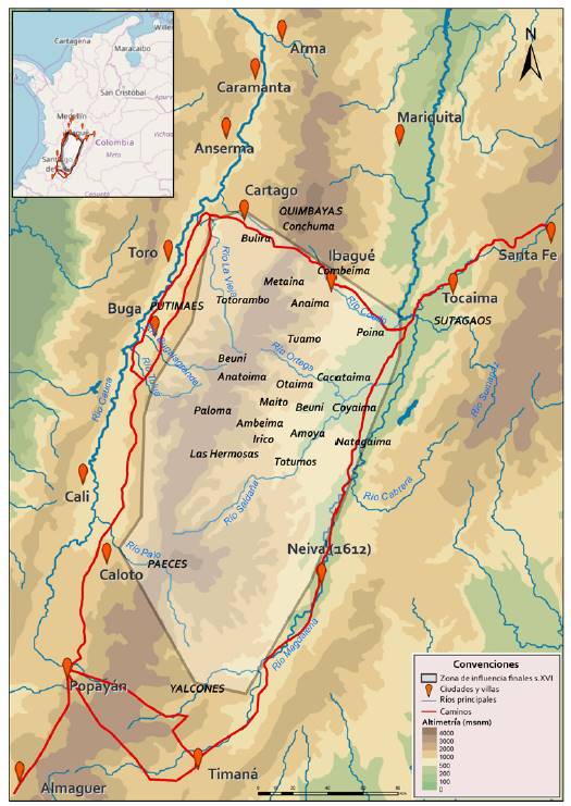 El término pijao, una aparente deformación española del nombre nativo pinao, hace referencia a un conglomerado de tribus que algunos investigadores han identificado como pertenecientes a un subgrupo de la gran familia lingüística karib que habitaron en la cordillera Central1, en una región que comprende, aproximadamente, los siguientes límites (Cubillos, "Apuntes" 47-48; Lucena 96): al norte, desde Ibagué y el río Coello hasta la ciudad de Cartago (hoy Pereira). En el sur, desde la desembocadura del río Páez en el Magdalena, hasta la falda occidental de la cordillera Central, a la altura de Caloto. Por el oeste, la banda occidental de la cordillera Central desde Cartago hasta Caloto. Por el oriente, el río Magdalena desde la desembocadura del Páez hasta la del Coello (AGI, p, 196, R. 27, ff. 98 v.-989 r.; Arango 388; Cubillos, "Apuntes" 50-52; Friede 169; Lucena 97-100; Simón 328-329) (véase figura 1).
