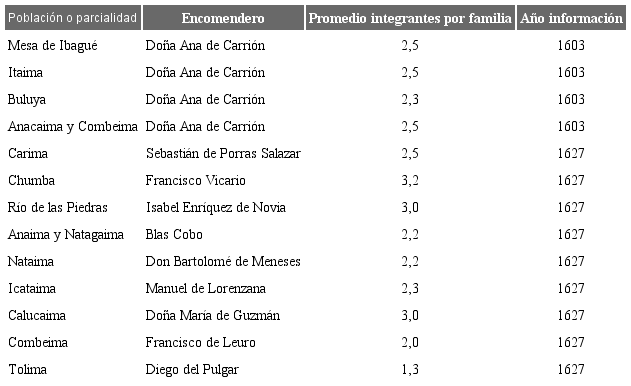 Si bien se presenta el problema de que se trata de familias muy posiblemente fragmentadas, o cuya organización cambió tras el proceso de conquista y pacificación, es el dato más cercano con el que se cuenta y según el cual se harán las siguientes estimaciones. El mismo visitador realizó diligencias similares el mismo año en los pueblos de Anaima, Natagaima, Nataima, Calucaima, Combeima y Tolima. Los promedios de integrantes por familia en cada una de estas poblaciones fueron de 2,2 (en las tres primeras), 2,3, 3,0, 2,0, y 1,3, respectivamente (véase tabla 1) (AGN, co, 43, doc. 42, ff. 788 r.-802 r.).