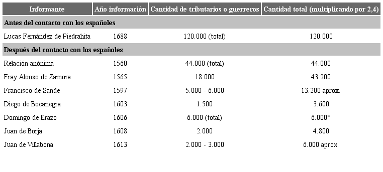 Sin embargo, y compartiendo la opinión del historiador Manuel Lucena Salmoral, algunas de estas cifras (exceptuando tal vez la del presidente Sande) se presentan como exageradas si se tienen en cuenta las informaciones de primera mano aportadas por soldados que participaron directa y activamente en la guerra contra estos indígenas. En 1603, el capitán Diego de Bocanegra manifestaba que en toda la tierra no habría más de 1.500 indios de guerra (Ortega 106). En su informe de 1606, el gobernador Domingo de Erazo afirmaba que "según la más cierta relación y tanteo serán todos seys mil yndios de guerra" (Arango 388). Para 1608, el presidente de la Audiencia, don Juan de Borja, comunicaba al rey que "segun la mas comun opinnion y lo que los prisioneros deponen serian entonces dos mill yndios gandules" (AGI, P, 196, R. 27, f. 998 v.).