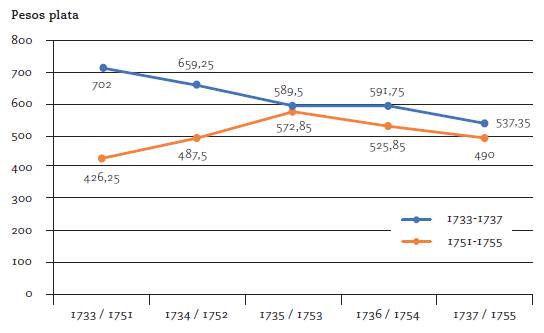 Durante el siguiente quinquenio, 1751-1755, el consumo promedio anual fue de ocho arrobas, es decir 7,5 kg mensuales, siendo la cuarta inversión de mayor importancia para el periodo (AGN, SAA-III, RH-C, 1254c).