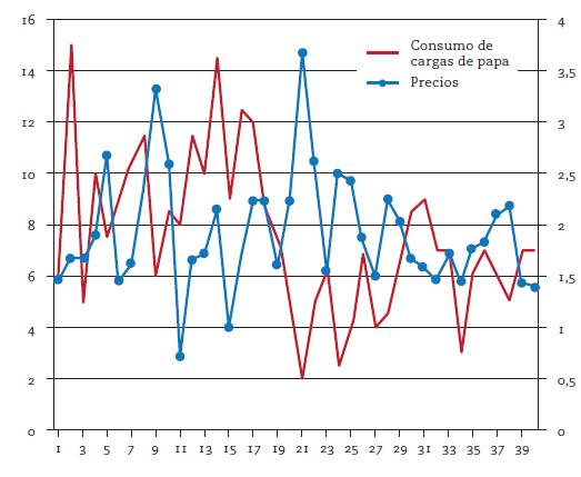 Para responder a esta inquietud hemos analizado la evolución del consumo de papa en función de los precios y las cantidades del producto en los dos quinquenios. Por tratarse de uno de los alimentos de la canasta básica del consumo santafereño en el siglo XVIII, consideramos que constituye una buena muestra del comportamiento económico de los dominicos frente al mercado (figura 4).
