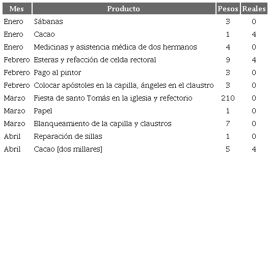 Una de las responsabilidades delegadas a los rectores fue el manejo de las cuentas de manutención. Los padres debían llevar libros de gastos y estos contenían, entre otras informaciones, aquella relativa a las compras de alimentos, enseres y objetos para el uso y el consumo de los colegiales. Al revisar las Constituciones de los padres dominicos para el Colegio de Nuestra Señora del Rosario, que se inspiraron en las del Colegio de Salamanca, podemos observar, por ejemplo, regulaciones más específicas en los temas de consumo de alimentos: