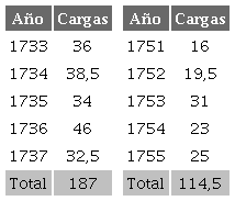 El segundo alimento en orden de importancia en la alimentación de la comunidad educativa eran las papas o "turmas"12. En el periodo analizado, entre 1733 y 1737 el consumo de este tubérculo fue de 12 0% del total del gasto, mientras que en 1751-1755 se redujo a un 8 0% Las turmas eran reconocidas por los españoles americanos como un alimento de "mucho sustento, y de muy buen gusto" (Zamora 42-43); y como lo pone en evidencia Basilio Vicente de Oviedo (96-105), se disponía de una gran oferta de este producto en diferentes lugares del altiplano, tales como Ubaté, Guatavita, Chocontá, Cajicá, Sesquilé, Sutatausa y Lenguazaque, entre otros. Un aspecto interesante fue la facilidad de articulación de este alimento en la dieta de los españoles, ya que generó menos resistencia que otros productos originarios de América, como, por ejemplo, el maíz. Se utilizaba de diferentes formas, bien fuera como guarniciones, o bien como ingrediente de algunas preparaciones específicas como el puchero o el ajiaco de papa (J. Vargas 135-136)13. En el CUST, para el quinquenio de 1733-1737, se compraron en promedio 37,4 cargas de papas al año y en el segundo periodo de análisis, entre 1751 y 1755, se adquirieron 22,9 cargas de papa en promedio por año (tabla 3).