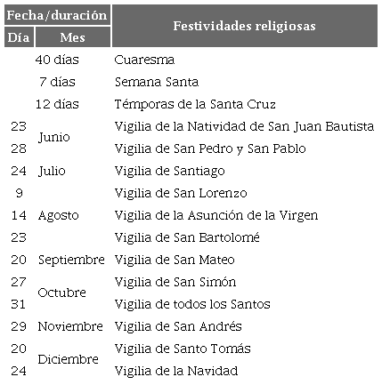 Según los registros del libro de gasto diario, uno de los consumos con mayor regulación, debido a la doctrina religiosa, fue el de carne. Cecilia Restrepo ha mostrado, por medio del estudio de las Constituciones utilizadas por los dominicos, cómo había prohibiciones al consumo de carne en los días de cuaresma y, citando a Toussaint-Samat, sugiere que inclusive se podría hablar de unos 180 días al año sin consumo de carne por parte de los colegiales (71). En el caso del CUST, aunque no se pudo constatar la afirmación de Toussaint-Samat, se encontró que la comunidad se abstuvo del consumo de carne durante setenta días, aproximadamente, fechas vinculadas con la cuaresma, la Semana Santa, témporas, más de una decena de vigilias y la celebración de la Natividad. Durante estas celebraciones se incrementaba el consumo de pescado, mientras que en las vigilias y las témporas se reemplazaban las proteínas bovinas y porcinas por mayores compras de leche y huevos o la preparación de sopas. Algunos de los registros ponen en evidencia la sustitución de la carne por otros alimentos, por ejemplo, en la tercera semana de junio de 1735 se anotó: "Dimos quatro r[eale]s p[ar]a guebos, y leche p[ar]a la Vigilia de S[a]n Juan", mientras que en septiembre de ese mismo año se destinaban los mismos rubros pero para dos celebraciones religiosas adicionales: "Dimos ocho r[eale]s p[ar]a la Vigilia de S[a]n Matheo, y otro día de Temporas, guebos, leche" (AGN, SAA-III, RH-C, 1254c, ff. 12 r.-v.). Las razones por las cuales no se consumían carnes rojas se relacionan con ideas sobre la purificación del espíritu (tabla 4).