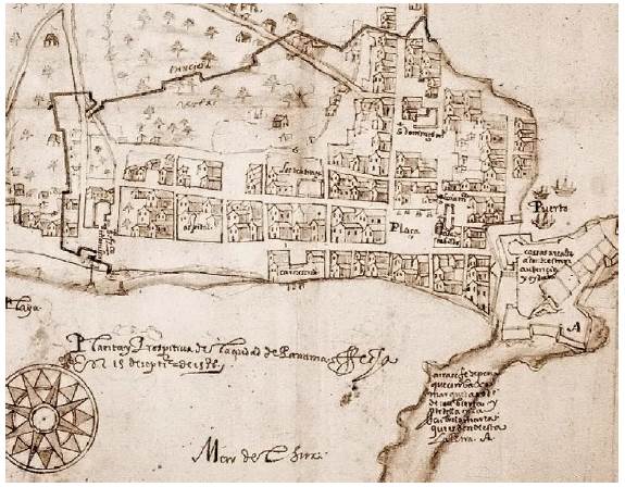 De Acla, fundada en 1515, no se sabe casi nada, mientras que de Nombre de Dios (figura 3), refundada por Pedrarias Dávila en 1519, hay algunas representaciones. Por lo que se deduce, tuvo que ser un puerto muy condicionado por la morfología del territorio, apretado entre altas montañas, el mar y dos ríos. Panamá pudo conformarse en una cuadrícula un poco más regular pero, como se ha visto, aún lejos de ser perfecta.