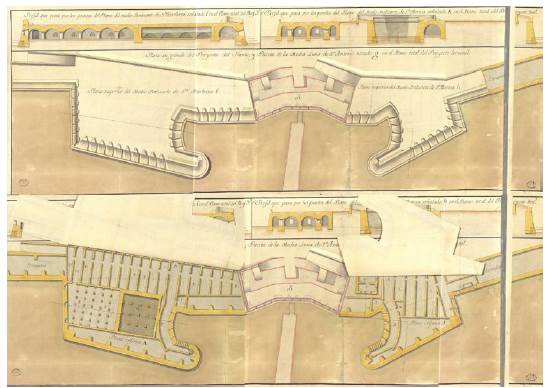 Aparte de estas obras, Solís también proyectó la construcción de unos cuarteles y unos almacenes de víveres y pólvora en los medios baluartes de Santa Bárbara y Santa Teresa (figura 2). Siguiendo el criterio del gobernador, Solís terminó situando el cuartel frente a la cortina y el baluarte de San Pedro Mártir, en tanto que los almacenes se proyectaron en los terrenos que había junto al baluarte de Santa Catalina. Sin embargo, parece que esta propuesta no llegó a efectuarse, pues no existe ningún documento que lo acredite, de modo que la ciudad quedó sin suficientes almacenes. Dicha situación sería solucionada en 1789 por Antonio de Arévalo con su propuesta de levantar otros de gran relevancia, en paralelo a la cortina de Santa Catalina (Gámez, "Ingenieros militares y obras públicas" 135). En último lugar, el ingeniero ofreció cerrar con una muralla el portillo que continuaba abierto en la marina, concretamente entre los baluartes de Santa Clara y Santa Catalina (Marco, Cartagena de Indias: Puerto 270-271).