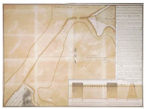 Por otro lado, Bocagrande había sido el tradicional acceso a la bahía de Cartagena, al igual que la denominada Bocachica, que se encontraba en un lugar más alejado. La primera había quedado inutilizada a mediados del siglo XVII, pero ante la posibilidad de su reapertura, en 1741 se ordenó a los ingenieros directores Desnaux y Mac-Evan su cierre. Ambos reconocieron el acceso junto a Arévalo, quien levantó un plano en 1750 por orden de Ignacio Sala, a quien, al año siguiente, se le encargó el cierre de dicha entrada a la bahía. No obstante, el temporal de 1752 deterioró en gran medida estas obras, por lo que, tras varios intentos, el ingeniero en jefe Manuel Hernández propuso a Sala un nuevo sistema de cierre, al que sucederían los proyectos realizados por Solís, Arévalo y Manuel Anguiano (Laorden 163). Cabe destacar aquí el proyecto de cajones de madera de Lorenzo de Solís (figura 3), que se terminó desechando por haber sido afectados por las corrientes y un molusco llamado broma, a lo que se añadió el elevado costo que suponía para la Corona (Galindo y Fontás 464-466). Aun así, lo más relevante de este episodio fue el trazado para la escollera (figura 4), realizado en 1757 por el ingeniero, donde además de representar el proyecto de los cajones, dibujó la planta del dique (Laorden 167). Dicho trazado lo realizó partiendo de la punta de la playa hasta la isla de Tierrabomba, pasando por encima de los restos del fuerte de San Matías (Galindo y Fontás 466).