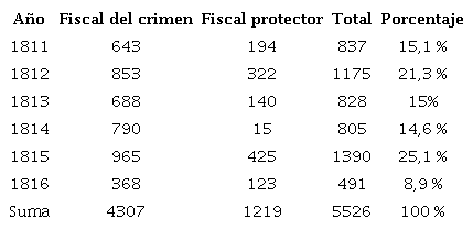 Como se ha podido apreciar, los fiscales del crimen continuaron desempeñando el cargo de protector general de naturales en el distrito de la Corte novohispana, aunque, como veremos, los otros fiscales, de lo Civil y de Hacienda, se inmiscuían de igual manera en determinados asuntos cuando rozaban sus competencias. Por medio de las cuantificaciones de Osés vemos con claridad que, a pesar de la presente tesitura bélica, la cotidianeidad de la vida continuaba y debían despacharse todo tipo de causas en defensa del colectivo. Los datos que ofrece en su memorial merecen algo de detenimiento. Como puede observarse en la tabla 1 (AGI, M, 1644), las causas relativas a la apelación del Juzgado General de Indios solían ser muy inferiores a las criminales. Llama la atención, claro está, el descenso que sufre a partir de 1812, una vez establecido el régimen constitucional a finales de septiembre de aquel año, por lo que quedó así abolida la jurisdicción especial (Lira, “Extinción” 195-196), aunque continuaron llegando causas motivadas para el fiscal protector. Estas sufrieron un repunte tras la restitución del absolutismo en mayo de 1814 y la promulgación del edicto en Nueva España el 4 de diciembre de 1814, de manera que repercutieron con un salto de más de cuatrocientos casos entre ese año y el siguiente, seguramente muchas de ellas acumuladas, en espera de asignarse a esa parcela judicial, o bien transferidas al protector por su condición.