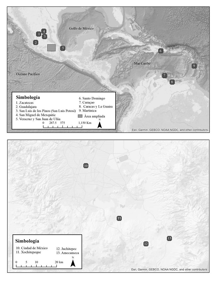 Con respecto a su bautizo, en los expedientes hay una copia de su certificado bautismal en la Ciudad de México. Dicho sacramento quedó asentado en el folio 138 v. del “Libro de bautismo de las personas de color quebrado” del año 1773, que pertenecía al sagrario de la Santa Iglesia Catedral de México. Así lo certificó el 22 de mayo de 1774 y mediante copia compulsada don Juan Francisco Domínguez, cura de dicha catedral. El mencionado sacerdote lo examinó y, al no estar seguro de los conocimientos de la religión católica que Juan Nepomuceno tenía, decidió bautizarlo sub condicione. Pero este no fue su único ni último bautizo. Se sabe que, cuando menos, intentó bautizarse en Xochitepeque, Amecameca y Juchitepec (véase figura 1) (AGN, I, vol. 1165, ff. 2, 5-6, 17-18, 111).