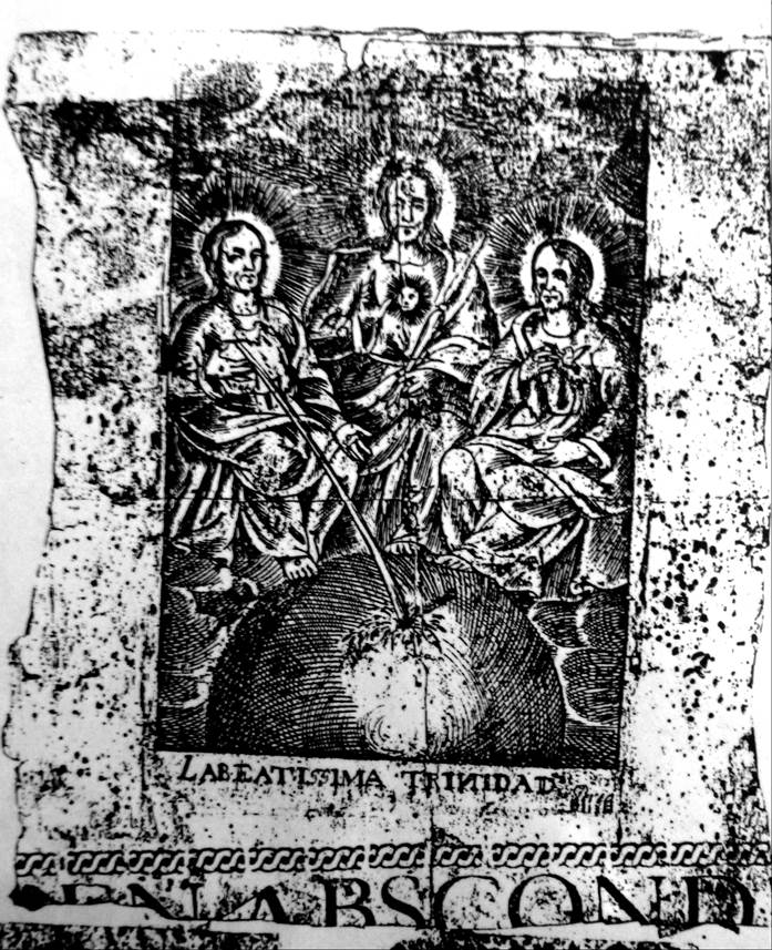 traía dos estampas metidas en los zapatos debajo de las plantas de los pies. Con cuyo motivo lo mando subir cargando a su habitación y lo mandó reconocer a presencia de Don Antonio Pablo de Montes y dicho su Teniente Don Mathias de Villaverde quien lo descalzó y con efecto vieron todos, las dos estampas que traía en un zapato en la forma referida. Una de la Santísima Trinidad y otra del Nuestro Padre Fray Bartolomé Gutiérrez del Orden de San Agustín. Las que recogió el declarante y guarda en su poder y las conserva de orden del Señor Provisor a quien hizo demostración de ellas. (AGN, I, vol. 1162, f. 8)