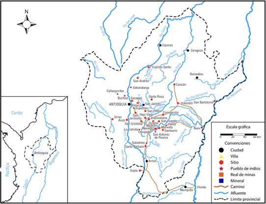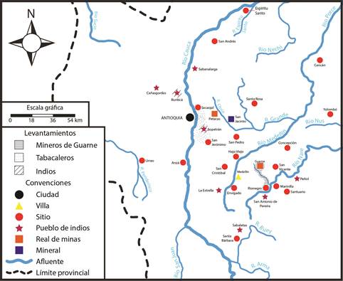 Aunque la insurrección empezó en el Socorro, tuvo un efecto dominó en otras provincias. Autores como Mario Aguilera Peña y Katherine Bonil han analizado los alzamientos que se dieron en los Llanos, el Alto Magdalena y otras partes del virreinato (Bonil, “The Political Culture”; Bonil, “De un rey nuevo”; Aguilera, Los comuneros). En el caso de Antioquia, quien ha estudiado de forma más juiciosa los levantamientos en el contexto comunero ha sido Juan Guillermo Espinal Barrientos. Además, se encuentran las investigaciones más breves realizadas por Víctor Álvarez, Alicia Giraldo y Elizabeth Karina Salgado. Lo que han mostrado estos estudios es que en Antioquia se desataron cuatro conflictos: los levantamientos de los mineros en Guarne y Rionegro; de los tabacaleros en el cañón del río Cauca, cerca de la ciudad de Antioquia; de los indígenas de Buriticá y Sopetrán; y el descubrimiento de una supuesta conspiración armada por los esclavos para proclamar su libertad. Los alzamientos fueron de carácter multiétnico y estuvieron relacionados con la introducción de un impuesto para los mazamorreros, el aumento del precio del aguardiente y el tabaco, y el endurecimiento de las medidas para mantener el monopolio de esos mismos productos. En la figura 1 se representan las zonas de influencia de los levantamientos de los mineros, los tabacaleros y los indios.