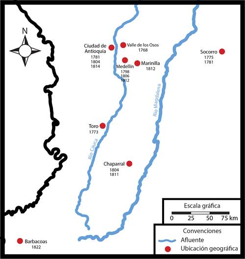 En la provincia de Antioquia se registran varios casos en que los esclavos se organizaron para reclamar o averiguar con las autoridades sobre la supuesta libertad concedida por la cédula real3. Como se mencionó en la introducción, este artículo se enmarca en un episodio que tuvo lugar en 1781, producido en el contexto de la insurrección comunera en la provincia de Antioquia. A diferencia de los otros sucesos acaecidos a raíz de los rumores de la cédula, este se encuentra muy bien documentado, gracias al expediente que se llevó en contra de varios esclavos. Se plantea como objetivo principal identificar, describir y caracterizar los rumores que surgieron sobre la real cédula entre 1781 y 1782 en la provincia de Antioquia, y se presenta una lectura del expediente judicial en el que se recogen los pormenores del caso. Esta lectura se relacionará con un análisis de las redes de sociabilidad que existían entre los esclavos, las que se pusieron en funcionamiento entre las élites del Cabildo local y los puntos de contacto entre ambas esferas.