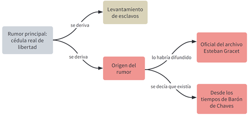 Durante el proceso judicial, tanto el gobernador, don Cayetano Buelta Lorenzana, como don Alonso Elías Jaramillo, capitán a guerra de Rionegro, interrogaron a un total de 48 personas, de las cuales 35 eran esclavos mulatos y negros, y 13 eran hombres libres de todo tipo y calidad: mulatos, negros y blancos. De estas indagaciones se deduce claramente que los esclavos estaban seguros de la existencia de una cédula real que los liberaba y que las autoridades locales no querían hacer pública, como también que difundieron esta información por toda la provincia. Alrededor de este rumor principal se tejieron otros dos rumores que fueron configurando un imaginario de libertad en los esclavizados y de temor entre las autoridades (véase figura 4).