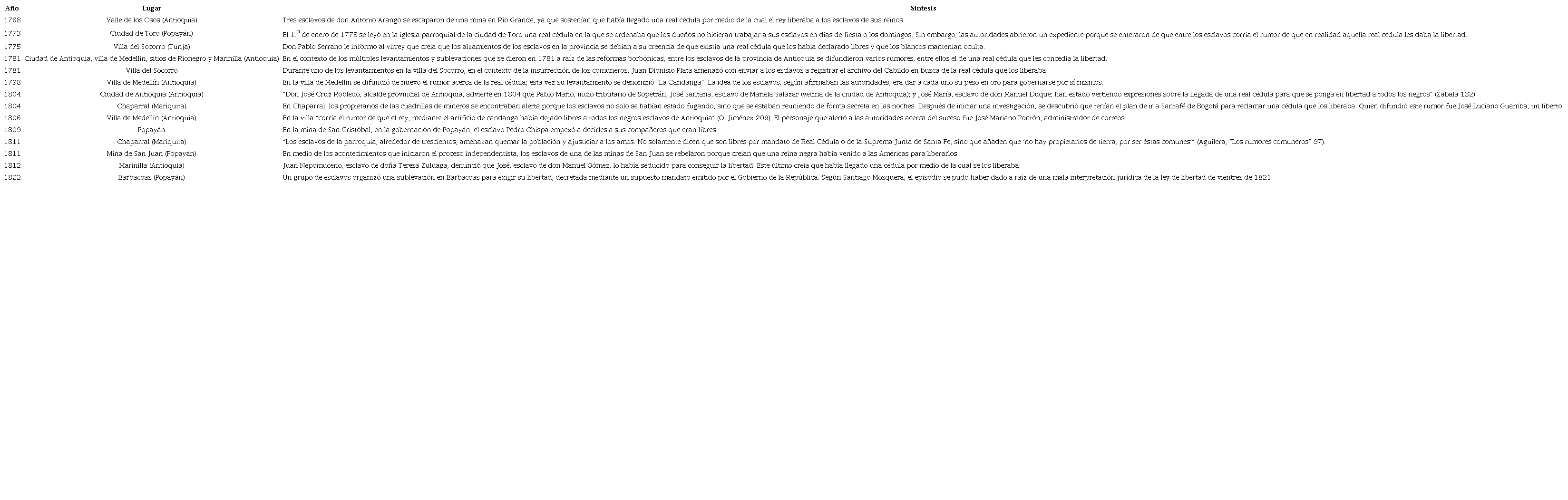 Este caso de los esclavos de Antioquia que se movilizaban por el rumor de que el rey les había concedido la libertad se agregó a un conjunto de otros episodios que tuvieron lugar más o menos por el mismo periodo en el virreinato. En el Nuevo Reino estos rumores aparecieron durante la segunda mitad del siglo XVIII y la primera parte del XIX (véanse tabla 1 y figura 2).