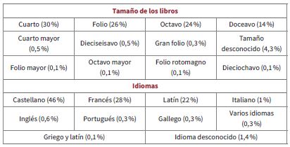 Dolores Campos menciona que el contenido de una biblioteca personal siempre encubre funciones sociales y políticas, brinda información sobre los gustos de los individuos y sus concepciones más comunes que determinan su posición dentro de las élites de poder o cultura a las que pertenecen; es decir, colman la demanda intelectual de sus propietarios, a la vez que dan muestra de su poder adquisitivo y estatus social (Campos 91). Por tanto, el formato ponía en evidencia el lujo de los libros, un aspecto que se consideraba junto con el tipo de papel y los forros que se empleaban (Gómez y Téllez 78-83); así, la preponderancia de las impresiones en cuarto y octavo, además de la gran cantidad de textos en folio, forrados casi en su totalidad en pasta, permite deducir que se trataba de una biblioteca de trabajo variopinta; es decir, pese a contar con una buena colección de gran formato, que implicaba una alta inversión monetaria, también tenía muchos textos de mediano costo, los cuales estaban impresos mayoritariamente en castellano, francés y latín, con pocos ejemplares en italiano, inglés, portugués, griego y gallego, aspecto que influía también en el costo de las obras (tabla 1).