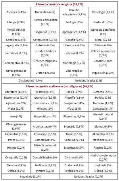 Poco más de un tercio concernían a temáticas religiosas (39,2 %) y el resto versaba sobre materias no relacionadas con la religión (60,8 %). Del primer rubro destacan las obras sobre ascética, homilética, derecho eclesiástico, patrología, liturgia, historia eclesiástica y teología, mientras en el segundo preponderaban las de literatura, historia, poesía, derecho, diccionarios, gramática, filosofía, política y agricultura. Aunque en menor número, también contaba con obras sobre oratoria, vida religiosa, inquisición, ortografía, contabilidad, minería, pesca, mecánica, jardinería, veterinaria, óptica, retórica y música, lo que permite puntualizar que Caballero y Góngora se interesaba por una diversidad de temas que iban más allá de su esfera laboral y social (tabla 1).