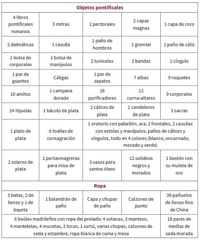 Con esto, el prelado no estaba obligado a cumplir con la Sacrorum liminum y, aunque reconocía el juramento de “sostener las regalías de San Pedro y San Pablo”, solo debía obediencia al rey (Domínguez 78-79). Empero, sí tenía que cubrir el resto de los requisitos para ocupar una jurisdicción en la Indias, como lo era el formar un inventario o registro legal de sus bienes, porque según la Corona convenía: