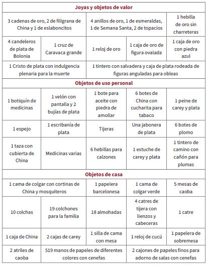 Los inventarios de bienes resultan de gran utilidad para contestar preguntas en torno a estos temas particulares, debido a que como fuente histórica permiten conocer aspectos que van desde el gusto por las modas o el tipo de consumo hasta los mecanismos utilizados para ser aceptados en ciertos sectores sociales. Son registros documentales que permiten responder a la pregunta: “¿por qué las personas y grupos sociales adquieren las cosas que adquieren?”, la cual hace referencia al hecho de que “la clase de bienes que consume la gente coadyuva en las definiciones identitarias, ya fueran étnicas, culturales o de clase” (Moreyra y Alves 5). Además, su elaboración por parte de las autoridades y los peritos estipulados conforme a ley les proporciona cierto grado de exactitud y veracidad que permite conocer el monto y el nivel de riqueza, sus influencias ideológicas y políticas, su estilo de vida y su gusto estético (Gómez y Téllez 77-78).