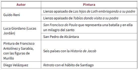Su pequeña pinacoteca gozaba de obras realizadas por prestigiosos artífices, como Esteban Murillo; Antonio del Castillo; Alonso Cano; Guido Reni; Francisco Antolínez y Sarabia; Luis, el Divino Morales; Lucas Jordán; Tiziano; Juan de Toledo; Diego Velázquez; Francisco Herrera, el Viejo; Pablo de Céspedes; Giovanni Francesco Barbieri, il Guercino; David Teniers, el Joven; Francesco Solimena; José Antolínez; Juan de Arellano; José de Ribera, el Españoleto; Pedro de Orrente; Mateo Cerezo; Pedro Pablo Rubens; Juan de Espinosa; François Girardón; Juan Carreño de Miranda y Alberto Durero (“Solicitud”, ff. 20-21).