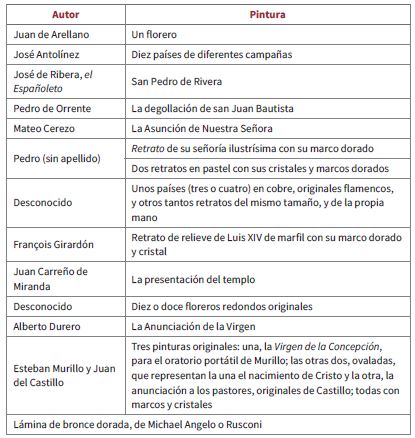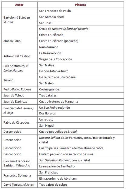 Esta variada colección de arte, conformada en su mayoría por lienzos del siglo XVII, abarcaba pintura del Renacimiento, del Siglo de Oro y del Barroco, procedente de las más afamadas escuelas pictóricas europeas, como lo fueron las de Sevilla, Flandes, Venecia, Madrid, Valencia y Toledo. Las temáticas preponderantes eran las escenas bíblicas, imágenes de Cristo, advocaciones marianas, así como representaciones y vidas de santos; no obstante, poco más de un tercio correspondía a retratos, pinturas de batallas, floreros, fruteros, “países” o paisajes flamencos, escenas costumbristas, bodegones e incluso una cocina de Rubens, obras que tenían una clara función decorativa. Además, había un relieve en marfil de Luis XIV realizado por el célebre escultor Girardón y una lámina de bronce dorada que se decía de “Michael Angelo o Rusconi” (“Solicitud”, f. 21; tabla 3). Todos estos objetos eran de gran valor monetario y artístico, pues se trataba de piezas únicas, de valía histórica en el arte europeo.