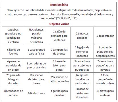 En el inventario se registran peculiaridades sobre las máquinas que trasladó consigo a América, entre las que se encuentran: una eléctrica con dos globos grandes, otra para la neumática con recipiente, una más para la física con un vaso grande, una cámara oscura y estampas para la óptica. En contraparte, su amplia colección de numismática fue simplemente registrada como: “un cajón con una infinidad de monedas antiguas de todos los metales dispuestas en cuatro sacos cuyo peso es cuatro arrobas, dos libras y media, sin rebajar el de los sacos y papeles”, sin proporcionar información sobre los tipos, las calidades y los valores (“Solicitud”, f. 22; tabla 4).