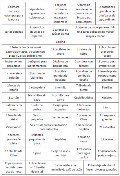 El último conjunto de objetos eran los utensilios y las herramientas de cocina, como una batería grande, instrumentos para la masa y labrar manteca, chocolateras, cuchillos, sellos, barriles, botellas, saleros, trébedes, parrillas, fuentes, vasos, copas, frasqueras, molinillo para café y bandejas (“Solicitud”, ff. 20, 22; tabla 4). Estos eran parte de un cambio en la alimentación y su ceremonial que ocurría en España, que afectaba la forma de entender la comida y los rituales en torno a ella, así como las normas de urbanidad en la mesa; se relacionaban con la idea del buen gusto, de la cocina como arte y su consideración como ciencia, a lo que se sumaba la circulación de manuales españoles que detallaban las normas higiénicas de la mesa y el uso de utensilios (Suárez 259-264).