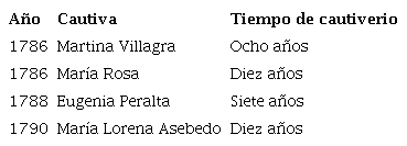 Durante las expediciones a Salinas Grandes que se llevaron adelante a fines del siglo XVIII, fueron rescatadas algunas mujeres hispanocriollas que no mostraron resistencia ante el hecho de tener que regresar a sus lugares de origen y que habían permanecido en cautiverio por más de cinco años, tiempo mínimo requerido para lograr el aprendizaje del mapu dungum (Villar et al., “… por entender su idioma” 327; Villar et al., “La comunicación interétnica 82). Incluso, hemos documentado un caso de una cautiva llamada María Rosa, que se fugó en 1786 de la toldería del cacique Quentau y se presentó voluntariamente ante el comandante Pinazo después de haber vivido en tierra adentro por diez años. Ella disponía de información acerca de otros cautivos que no dudó en comunicar al maestre de campo. En la tabla 1 se presentan los casos mencionados.