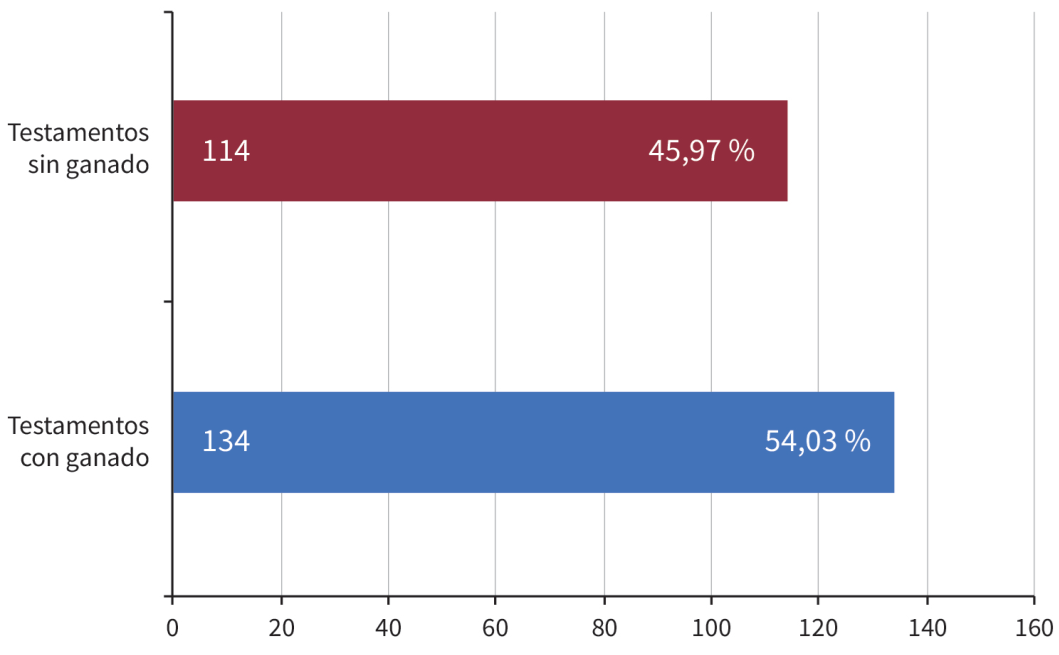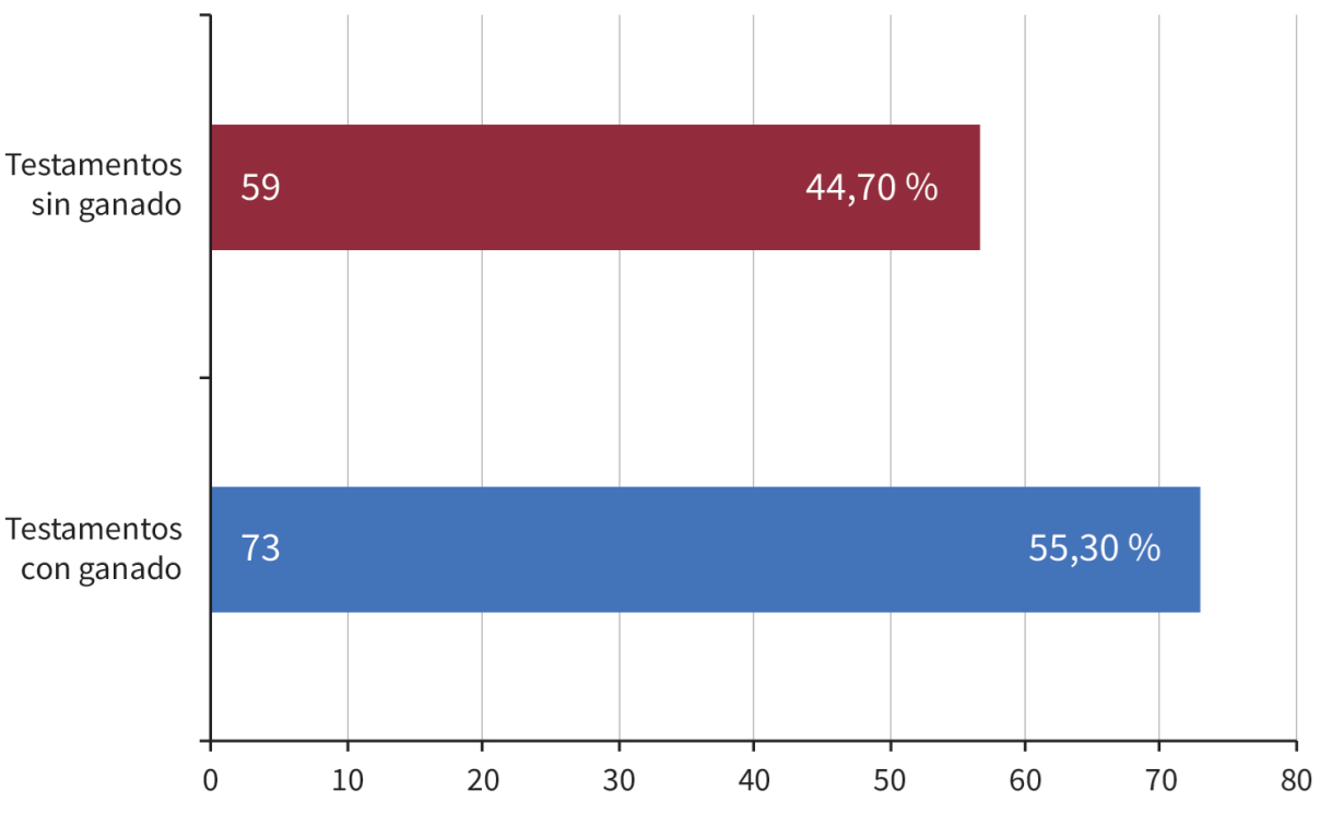 En el caso de Valencia de Jesús, como se muestra en la figura 2, entre 1727 y 1798 se registraron 132 testamentos de vecinos, de los cuales 78 consignaban como bienes legados algún tipo ganado, especialmente vacuno.