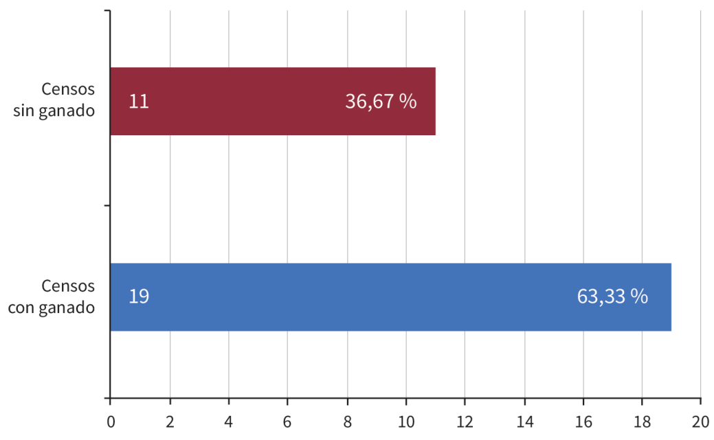 Las operaciones civiles que se materializaban en censos también fueron muchas, especialmente cuando los prestadores eran cofradías. Por ejemplo, a nombre de don Pedro Regalado de Argote, vecino de Valencia, y Rosa Bolinches, viuda esta última, madre del otorgante, se reconocía el 29 de mayo de 1756 unas vacas de vientre pertenecientes a la cofradía de la Santa Veracruz, por las que pagaban anualmente al mayordomo 9 terneros de “corridos”, por lo que debieron hipotecar 60 reses de vientre y un atajo de 12 bestias caballares para respaldar el censo (NPV, N, t. 2, ff. 129 v.-131 r.). En la misma tónica, don Mauricio López Nevado, vecino de Valencia, en 1752 reconoció ser fiador principal del capitán don Josef Mendívil, que tenía a su cargo y entre sus bienes el número de 56 vacas de vientre pertenecientes a la cofradía de Jesús Nazareno, avaluadas en 224 pesos, a 4 pesos cada una, por lo que en reconocimiento de dicha media renta hipotecaba López Nevado un zambito criollo de 7 años, y pagaba de rédito cada año 8 cabezas de ganado vacuno, es decir, cerca de 160 pesos por la suma prestada (NPV, N, t. 2, ff. 75 v.-77 r.). Como señalamos, los prestamistas recibían ganado vacuno, pagaban réditos con ganado e, igualmente, hipotecaban ganado. Este bien era importante, y se encontraba en la mayoría de las transacciones de crédito en la ciudad de Valencia de Jesús (figura 6).