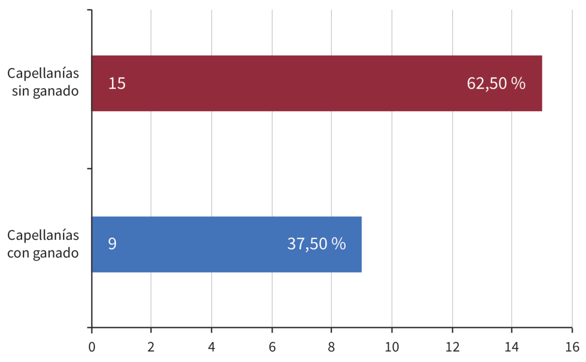El ejemplo más significativo de fundación de una capellanía, por la información que brinda, es el de Felipe Carbonell e Isabel de Sosa, esposos, quienes como fiadores y principales pagadores, vecinos de Valencia de Jesús, decidieron que, por hallarse vaca por muerte del capitán Josef Mendívil, el principal de una capellanía de 493 pesos y 4 reales en ganado vacuno y caballar, y de la que era “patrón y capellán” Francisco Ruiz de Costo, presbítero, ellos la asumirían, por lo que procedieron a hipotecar una serie de bienes para responder por el dinero, por lo cual entregaron 80 reses de un año y un atajo de yeguas mansas con su padrote (tabla 3).