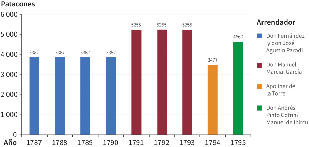 En el caso de Valencia de Jesús, en la figura 9 se muestra el valor de los remates y el nombre del arrendador en esa ciudad entre 1786 y 1795, un periodo de diez años. Anotemos antes que un dato expuesto en el pleito señala que entre 1780 y 1788 el valor del remate de los diezmos en la zona de Valencia de Jesús arrojó la suma de 22 499 pesos, es decir, un promedio de 2 499 pesos anuales en nueve años. Si se considera que en 1786, 1787 y 1788 se recolectaron 11 049 pesos y los restamos de la suma de los 22 499 pesos, descubrimos que entre 1780 y 1785 el valor del remate fue de 11 450 pesos, un promedio de 1 908 pesos por año. Así, se observa un alza en el valor del remate a partir de 1786. Entre 1780 y 1795 el valor de los remates fue de 45 499 pesos, con un promedio anual de 2 843 pesos pagados por el arrendador.