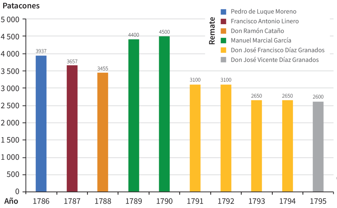 Para iniciar, en la figura 8 se presentan los datos sobre los diezmos del partido de la ciudad de Valledupar, donde se discriminan los años del remate, el postor y su valor.