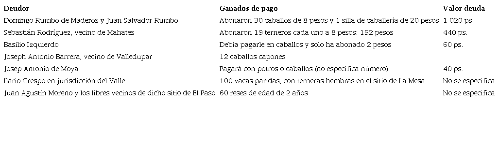 Por otro lado, llama la atención que Campuzano diera cuenta en su testamento de deudores que le pagarían ganados, como se muestra en la tabla 1.