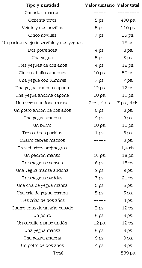 La herencia dejada por Aroca fue de 1 365 pesos, de los cuales 843 pesos estaban representados en diversos tipos de ganados. Aquí vemos nuevamente el grado de especialización ganadera, al describirse minuciosamente las calidades de los animales que Aroca poseía, como también sus precios. Llama la atención el reporte del ganado cimarrón, el cual, obviamente, no cuantifica ni valora, lo que significaba que las llamadas cimarroneras, ganado huido que se internaba en los montes, eran normales en la jurisdicción de Valledupar. Igualmente, la presencia de equinos era de gran importancia en la masa testamentaria.