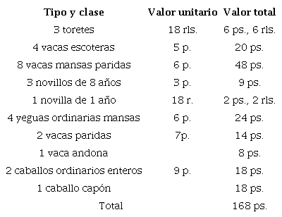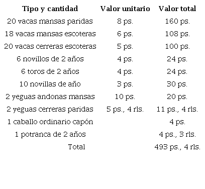 La composición detallada de la dote de Ana María Rodríguez Montalvo nos permite observar nuevamente que el ganado era un activo importante que se daba a las mujeres al momento de casarse. Si se desglosan los valores de la dote, se encuentra que un total de 501 pesos y 2 reales correspondían a ganados, y el resto se componía de los valores de los esclavos, las joyas, las tierras y los enseres del hogar. El ganado solo era superado en los valores totales por los esclavos, que llegaban a 1 820 pesos. Al igual que el ganado, los esclavos eran un activo importante y de fácil venta, que se podía capitalizar en cualquier momento. En este caso, el número de ganados no correspondía a la cantidad de esclavos, en caso de que se quisiera señalar que estos últimos se encargaban de los ganados.