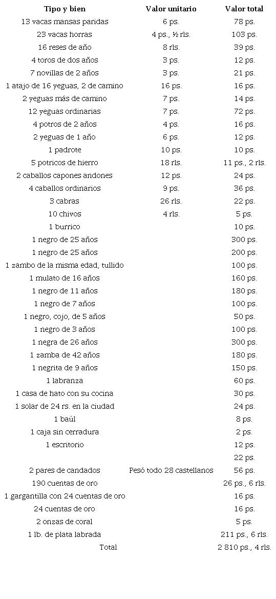 corrales en el sitio de Aguas Blancas, una caballeriza de 10 varas maltratada, una hacienda de campo de 1 747 pesos de avalúo de la tierra, una silla de vaquería maltratada con sus estribos, una silla de uso bien cuidada, dos frenos, un par de estribos nuevos, una efigie de Nuestro Señor Crucificado de Bronce mediano, nueve cucharadas de plata, un pilón con su mano y piedra de moler. (NPV, N, t. 1, ff. 104-111)