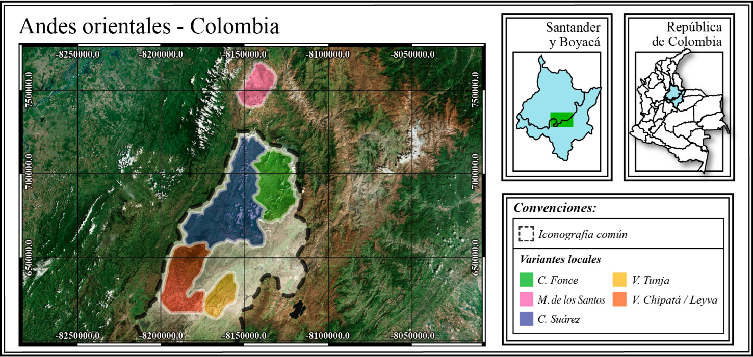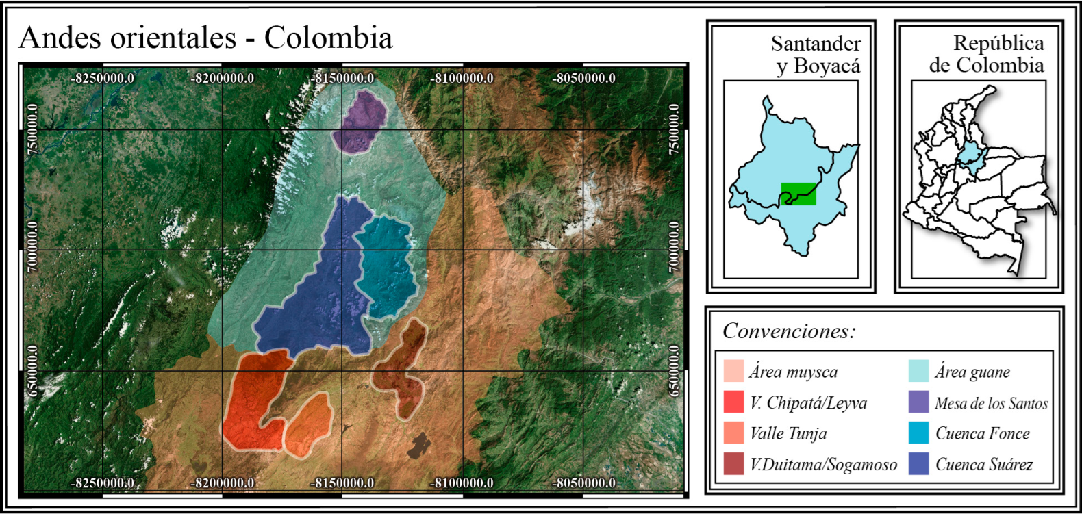 En los últimos siglos del periodo prehispánico y las primeras décadas del dominio colonial, la porción septentrional de los Andes orientales de Colombia fue habitada por múltiples grupos humanos de filiación lingüística chibcha. Aquellas comunidades, organizadas en cacicazgos, presentaban una amplia diversidad en sus estructuras sociales, sus trayectorias de cambio y en la escala de sus asentamientos (Langebaek, Los muiscas 168). La heterogeneidad cultural, manifiesta en el registro material, concuerda con las características bióticas y abióticas del territorio, marcadas por la presencia de distintos nichos ecológicos y unidades fisiográficas, así como por un amplio espectro climático sustentado en pisos térmicos diferenciados.