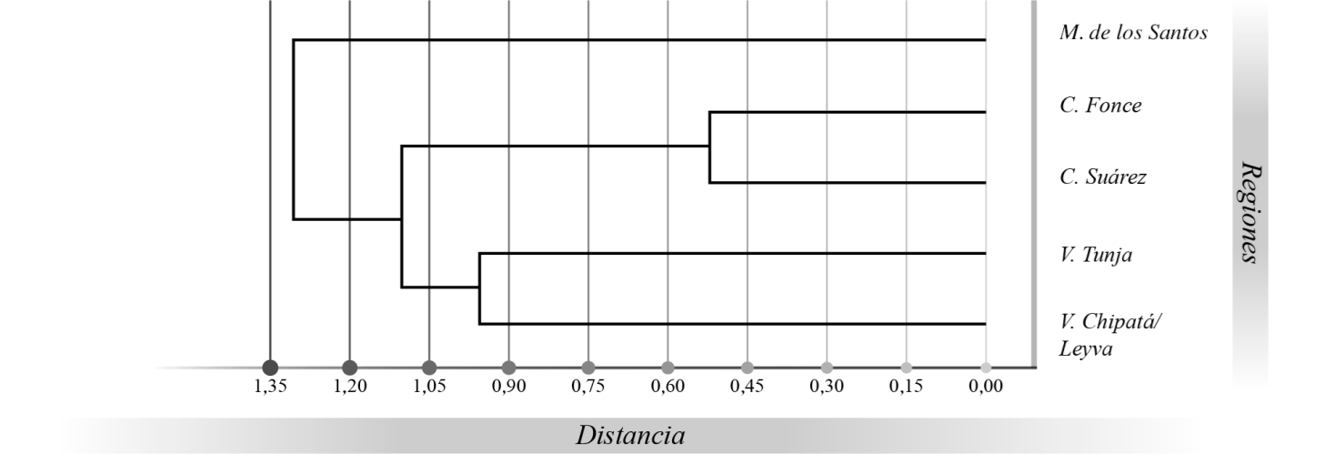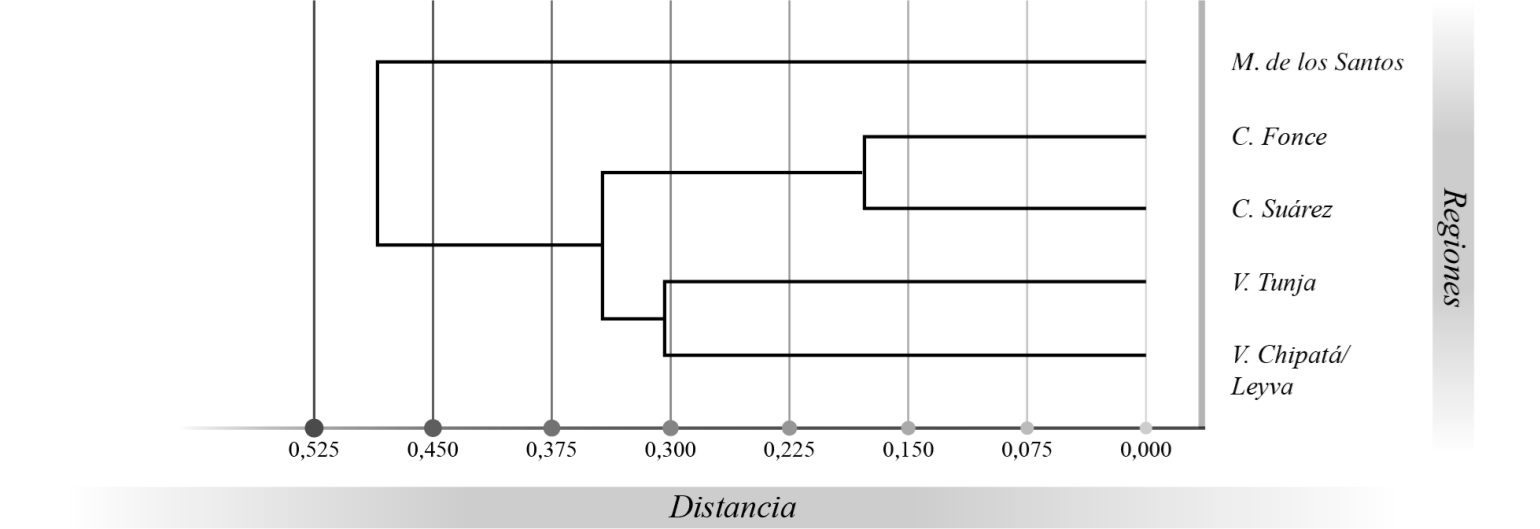 Al comparar las variaciones morfológicas de los objetos se aprecia un patrón similar, que se reafirma con el análisis de los atributos formales presentes en las copas. Estos son los objetos más numerosos, pues comprenden el 48,3 % de la muestra. Al igual que en la tendencia observada tras el estudio de las características tecnológicas, su agrupamiento muestra diferencias considerables en cada locación, al tiempo que da cuenta de relaciones particulares entre las distintas zonas. Por ejemplo, se aprecia una mayor cercanía en las piezas de las cuencas de los ríos Fonce y Suárez, que a su vez están agregadas a los conjuntos de los valles de Chipatá, Leyva y Tunja. Por último, aparecen las vasijas de la Mesa de los Santos, que cuentan con el menor grado de similitud con relación a todas las demás áreas (figura 3).