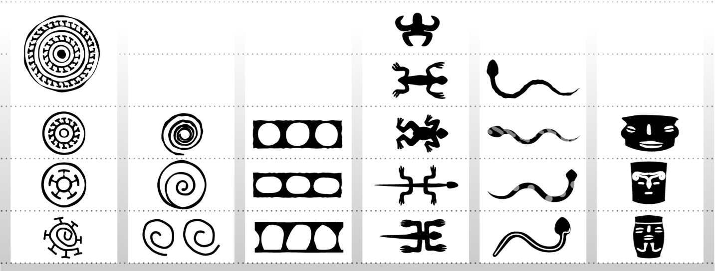 Esta tendencia se observa nuevamente tras el análisis estadístico de los rasgos decorativos. Al compararlos por medio del cálculo del coeficiente de Brainerd-Robinson, se identifica una similitud del 57,3 % entre los distintos conjuntos. Esta cifra disminuye en la Mesa de los Santos, región que expresa una semejanza del 44 % con respecto a las demás locaciones. Así mismo, destaca la presencia de ciertos rasgos decorativos comunes (figura 4), hallados en el altiplano cundiboyacense y en el sur del territorio santandereano. Sin embargo, estos no se encuentran de manera recurrente, pues cuentan con un <12 % de aparición.