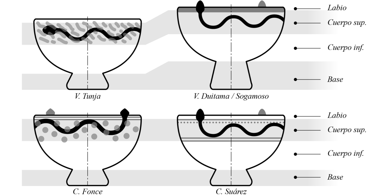 Las piezas incluidas en el estudio fueron seleccionadas de acuerdo con distintos criterios, como la disponibilidad de información sobre el municipio de hallazgo, la presencia de decoración y un estado de conservación que permitiera apreciar sus rasgos estilísticos. Así mismo, se empleó el tipo cerámico como marcador cronológico. Se incluyeron botellones, cántaros, copas, cuencos, jarras, múcuras, ollas y vasos, formas predominantes en los acervos de la región. Cada objeto fue registrado mediante fotografías y se documentaron sus atributos tecnológicos, como la atmósfera de cocción, las inclusiones de la pasta y el tratamiento de la superficie. De igual forma, se anotaron las variaciones morfológicas y los motivos decorativos. Los datos obtenidos fueron procesados por medio de un análisis modal, estadístico e iconográfico, que permitió comparar las características de la alfarería desde un enfoque cuantitativo y cualitativo3.