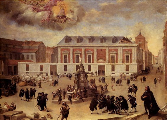 Durante el siglo XVIII, la villa de Madrid fue adquiriendo de forma creciente más relevancia en la organización de estos festejos8; no obstante, al tratarse de la capital y sede de los consejos y de la monarquía, el Ayuntamiento de Madrid era supervisado muy de cerca por las instancias reales. También su edificio, la Casa de la Villa, fue acrecentando su significancia y riqueza. Recordemos que el Cabildo de Madrid se reunía inicialmente en el siglo XVI en la iglesia de San Salvador, hasta que en 1610 se alquiló la casa del presidente del Consejo de Castilla, don Juan de Acuña, situada al lado de la iglesia. En 1629 el rey concedió licencia para construir un edificio nuevo en la antigua cárcel vieja y los edificios adyacentes. En 1644, Juan Gómez de Mora presentó un proyecto (figura 1), que fue continuado por José de Villareal y posteriormente por Teodoro Ardemans; la obra se terminó en 1692, con una arquitectura propia del Madrid de los Austrias, formada por un gran cuerpo rectangular y dos torres de ladrillo, con cimientos, cornisas y dinteles de granito, más la cubierta de pizarra9. La fuente de la plaza de la Villa, también conocida como de los Leones, fue trazada en 1618 por Rutilio Gaci, de forma ochavada, y contaba con cuatro cuerpos, adornada con las armas reales, leones, los escudos de la villa, máscaras, tarjas y óvalos. Fue finalizada en 1620 por Antonio Riera y Francisco del Río. Se remataba todo por una figura, que luego se retiró. Fue demolida por su mal estado a mediados del siglo XVIII10 y luego se reconstruyó con un diseño de Juan Bautista Sachetti. Un lienzo anónimo de hacia 1680, con la construcción de la Casa de la Villa y la fuente de la plaza de San Salvador con un milagro de la Virgen de Atocha, nos permite comprobar el diseño del edificio y de la fuente (figura 2). Habitualmente, el ayuntamiento cedía al Consejo de Castilla sus balcones y su edificio, puesto que algunos consejos desde antiguo contrataban balcones que daban a diversas calles y plazas para contemplar y asistir a los festejos reales, amén de que este consejo era el que tutelaba al propio Ayuntamiento de Madrid. Por ello, el cabildo debía adornar no solo su edificio, interior y exteriormente, quizá incluso haciendo algunas reparaciones, sino también el entorno de la plazuela de la Villa o plaza de San Salvador, y su fuente.