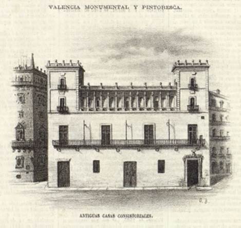 Las Casas del Ayuntamiento estaban magnífica y primorosamente adornadas. Por la parte exterior estaba plateado el Balcón principal, y en él un majestuoso y rico Dosel de Damasco carmesí con granjas de oro, y los Retratos de sus Majestades, para colocar a su tiempo bajo de él, y exponer a la vista del Público el Real Pendón: A sus lados blandones de plata, y arañas de cristal, é igualmente cubierto todo el rededor de damascos carmesíes. Lo demás de su frontis, y lados estaba adornado de un cuerpo de Arquitectura Jónica de bello gusto con imitación de hermosos jaspes: A cada ventana de los Balcones había dos pilastras, sobre las cuales corría una cornisa con jarros en sus macizos, y en el medio óvalo con la cifra de Carlos sostenidos por graciosos genios: A los lados sobre el plinto que sostenían las pilastras otros jarros llenos de flores, y un Muchacho que cogía ramitos: También había varias arañas adornadas de flores. En la parte inferior, y en el Patio tapices. Por la parte interior el Salón principal estaba todo cubierto de damasco carmesí, con una cenefa de pajizo, de la cual pendían graciosos colgantes de flores blancas: Sobre las colgaduras muchos espejos de diferentes tamaños en número de treinta y cinco, e igualmente varias lumbreras, y láminas de cristal. Alrededor de las paredes muchas mesas de piedra, y sobre ellas arañas de cristal de pie en número de veinte, y también varios Relojes muy preciosos de campanilla: Pendían del techo quince arañas de cristal: En su frente o testero estaba colocado el Retrato de cuerpo entero de nuestro Ínclito e Invicto Conquistador el Rey Don Jaime I de Aragón con adornos de Arquitectura imitados al mármol alrededor: A sus pies un Globo o Mundo, y sobre él la España misma de que se servía este Soberano; y a sus dos lados dos primorosísimas Estatuas según el más fino, y delicado gusto de la Antigüedad Griega: Y finalmente sobre la Puerta del otro frontis un magnífico Escudo de Armas Reales de oro sobre campo encarnado: Cuyo conjunto de adornos hacia a este Salón tan majestuoso, que con mucha dificultad podría concebirlo quien lo hubiere visto.