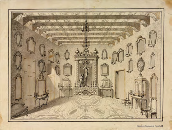 La Sala de la Capilla estaba también vistosamente adornada, y vestida de cortinajes alistados: Sobre ellos veinte y siete espejos de varios tamaños, algunas cornucopias, y tres arañas de cristal. El Altar del Santísimo Christo con variedad de alhajas, ramos, y luces. Por toda la Casa de la Ciudad había repartida una Compañía de Granaderos del Regimiento de Infantería de Victoria.41