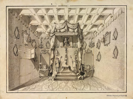 En 1789 tuvieron lugar los festejos de exaltación al trono de Carlos IV y la jura como príncipe de Asturias de Fernando VII, del 21 al 24 de septiembre. La organización por parte del Ayuntamiento de Madrid fue la ya comentada y tradicional. Contamos con un expediente muy extenso de todos los gastos realizados20. Por ello, sabemos que el costo total del festejo fue de 1 775 470 reales de vellón. En este caso, Madrid arregló y adornó como siempre sus casas consistoriales y las iluminó las tres noches hasta las torres. Por ejemplo, está documentado que se revocaron las tapias; que se doró el balcón donde se ponían los retratos de los reyes y también el balcón del Archivo; las puertas, las rejas, los balcones, las vidrieras y las ventanas -tanto interiores como exteriores- se pintaron de color de porcelana; se renovaron los azulejos para los frisos y los rodapiés del salón principal, de las restantes salas y del oratorio; se blanquearon la escalera principal, el soportal y la entrada de las secretarías. Además, el edificio se iluminó los tres primeros días con 4 347 candilejas y se adornó en su interior y exterior con catorce arañas, y con un dosel de terciopelo carmesí bordado en oro, que cobijaba los retratos del rey y la reina. También se cubrió el antepecho de todos los balcones con paño de terciopelo carmesí, con seis cornucopias grandes y pequeñas para las alas interiores.